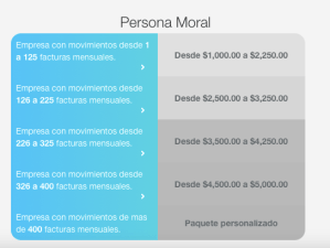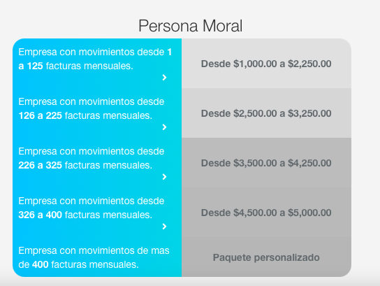Y cuatro paquetes para personas morales muy interesantes y si eres una empresa con movimientos de más de 400 facturas mensuales, tienen un paquete personalizado para brindarte la atención que necesitas.
